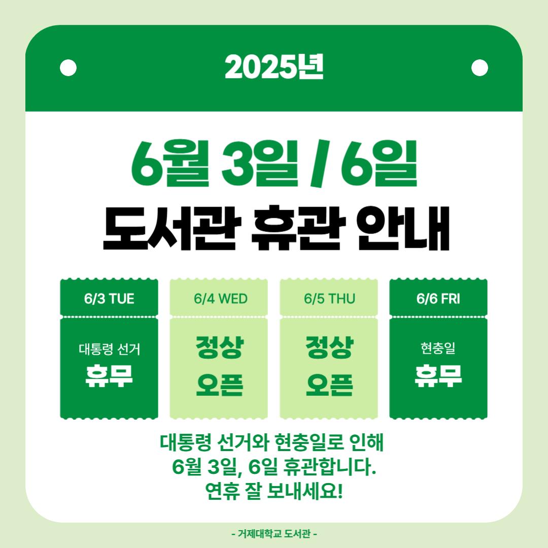 | 310 | 도서관 휴관 안내 (6월 23일~24일) | 관리자 | 2025-06-23 | 172 |