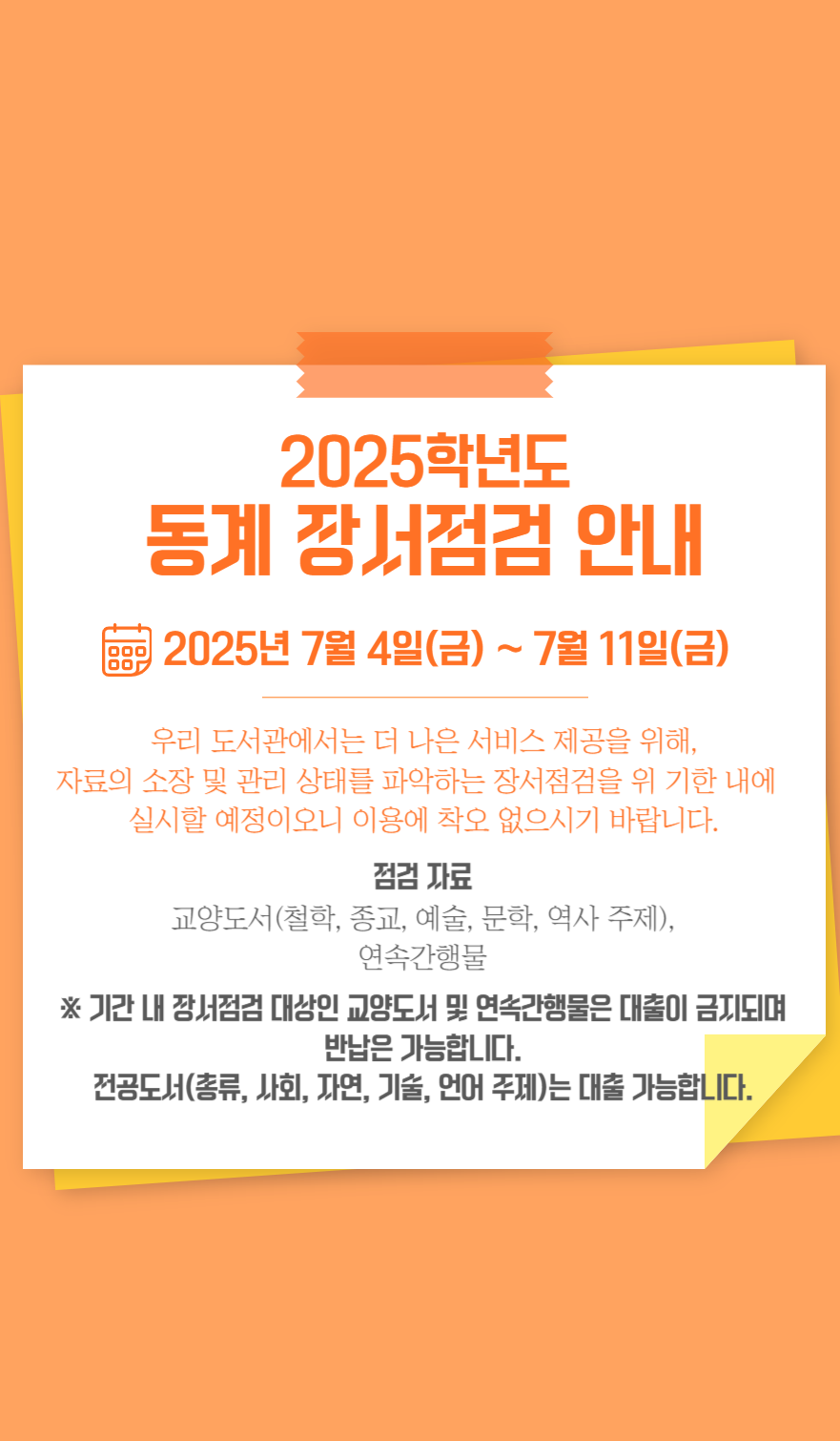 | ▶ 312 | 2025학년도 하계방학 장서 점검 안내 | 관리자 | 2025-07-02 | 138 |